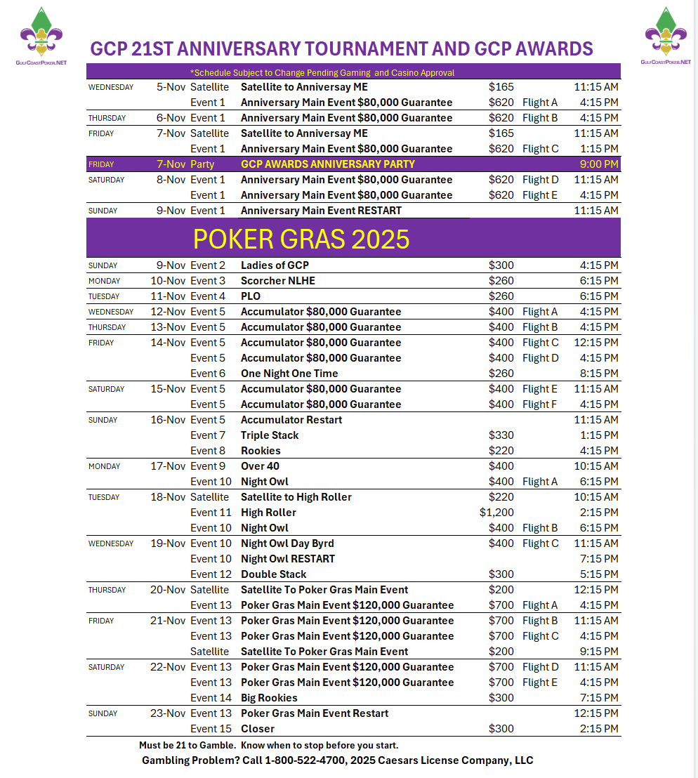 Poker Gras 2025 November 5th - 23rd at Caesars New Orleans.